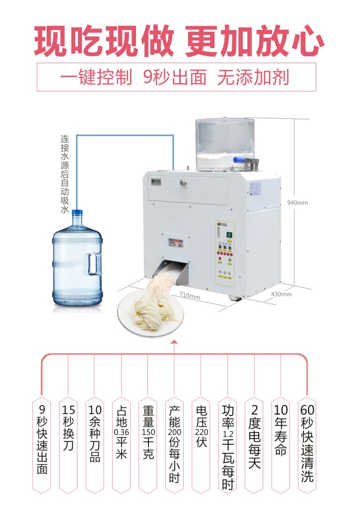 如今你開(kāi)面館,表面看起來(lái)生意很好,顧客眾多,其實(shí),掙不了很多錢(qián),原因就在面條制作工序多、產(chǎn)量少,出面時(shí)間長(zhǎng),翻臺(tái)率低,所以,賺的利潤(rùn)不多。如果你采用智能面條機(jī)來(lái)做面條,效率就高了,因?yàn)閺拿娣鄣矫鏃l只需要9秒左右的時(shí)間,一小時(shí)可生產(chǎn)200份,而且,生產(chǎn)出來(lái)的面條勁道,口感好,只要配菜和調(diào)料做得好,入口味美鮮香,那么,翻臺(tái)率就會(huì)大大提高,賺錢(qián)的速度就大大加快了。