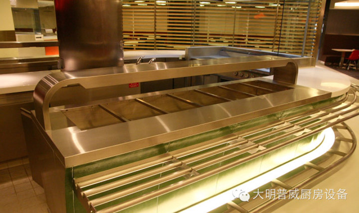 7、根據動作設計必須熟悉廚師的工藝動作,根據廚師工作時的需要配置設備,設計操作空間,遠近大小要合適舒服。例如,刀工取料、洗涮、切配、腌醬、裝盤、傳遞、清理案面都需要在合理的范圍內配置設備,這就需要制冷保鮮、工作臺、水池、碗柜等幾種設備搭配使用,距離太遠使用不方便,就會浪費時間,消耗體力,降低工效率。