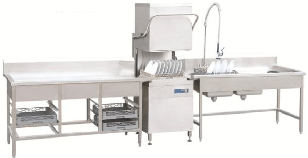 籃傳送式洗碗碟機,也叫通道式洗碗碟機、隧道式洗碗碟機。是采用籃筐傳動方式的一種洗碗機,加熱分為蒸汽式和電氣式兩種形式。通過傳送系統(tǒng)由傳送系統(tǒng)將碗碟等首先進人預(yù)清洗區(qū) ,由上下噴洗臂噴洗滌溫水進行預(yù)清洗.去除碗碟表面污漬然后進入潔洗區(qū),由上下噴洗臂噴清洗熱水進行清洗徹底清除油漬等,最后進入凈水漂洗除去表面的污水,達到洗凈的要求,洗凈的碗碟從出口端取出。可以清洗碟、碗、杯、盤、刀叉等器具,每小時洗滌量為200筐,適用于600餐位以下的酒店、賓館、員工食堂、學(xué)校、醫(yī)院等各種類型用餐場所。