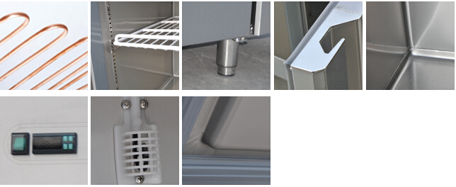 德國EBM冷凝風機,德國原裝蒸發風機,意大利卡樂溫控器,所有柜體的電器件符合歐洲CE認證標準。,箱體采用進口不銹鋼板,整體發泡,底板、門襯板為一次性拉伸成型,自動回歸鉸鏈,歐式結構。