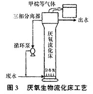 厭氧生物流化床可視為特殊的氣體進口速度為零的三相流化床。這是因為厭氧反應過程分為水解酸化、產酸和產甲烷3個階段,床內雖無需通氧或空氣,但產甲烷菌產生的氣體與床內液、固兩相混和即成三相流化狀態。厭氧生物流化床工藝如圖3所示。為維持較高的上流速度,需采用較大的回流比。厭氧生物流化床內微生物種群的分布趨于均一化,在床中央區域生物膜的產酸活性和產甲烷活性都很高,從而使其有效負荷大大提高。